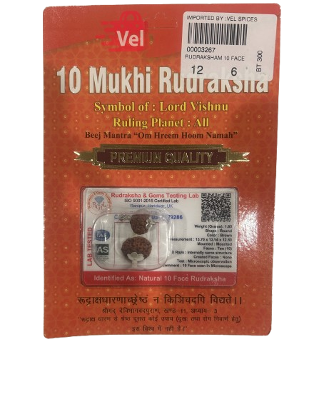 The 10 Mukhi Rudraksha is a sacred bead associated with Lord Vishnu and is believed to offer protection, positivity, and stability. It is characterized by ten vertical lines or faces, and is considered a powerful shield against negativity, evil spirits, and black magic.