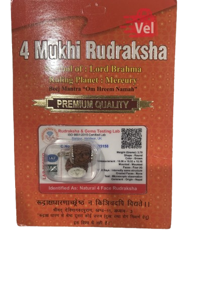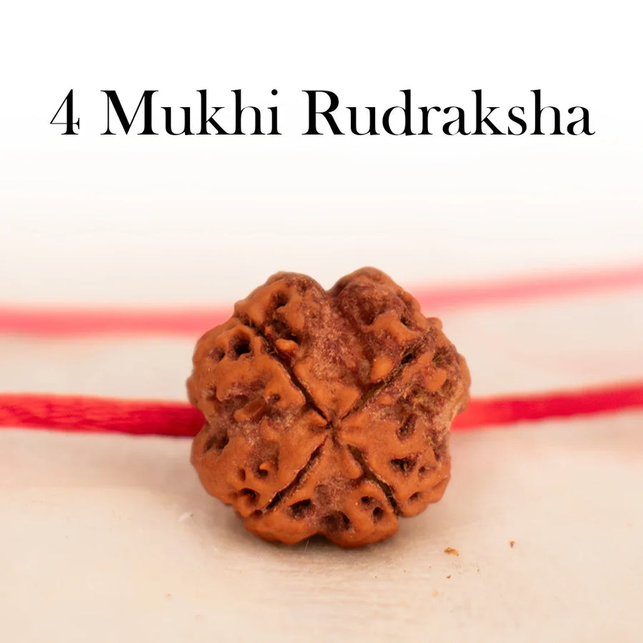 The four mukhi Rudraksha is a sacred bead with four natural lines or faces on its surface. It is associated with Lord Brahma, the creator of the universe, and is believed to enhance intelligence, communication, creativity, and mental clarity.