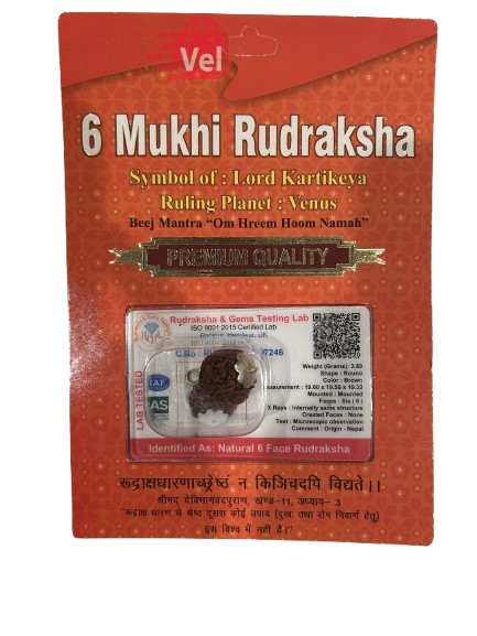 The 6 mukhi Rudraksha is a sacred bead with six natural lines (mukhis) on its surface, symbolizing Lord Kartikeya, the warrior son of Lord Shiva. It is associated with enhancing willpower, courage, and communication skills. It is believed to promote emotional balance, self-confidence, and mental clarity.