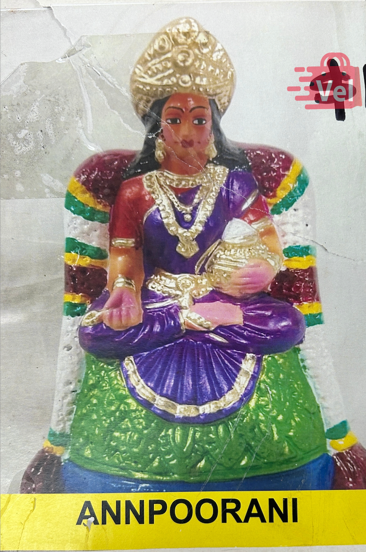During Navratri, Annapoorani (or Annapurna) is venerated as the Hindu goddess of food and nourishment, an aspect of Goddess Parvati who ensures her devotees are never without sustenance. She is depicted with a pot of food and a ladle, symbolizing her ability to provide abundance and her connection to the provision of both physical nourishment and spiritual knowledge.