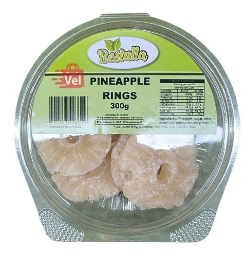 Bestalla Pineapple Rings are naturally dried Australian pineapple rings, known for their sweet and tangy flavor, firm texture, and golden color.