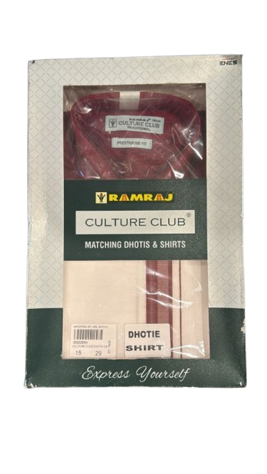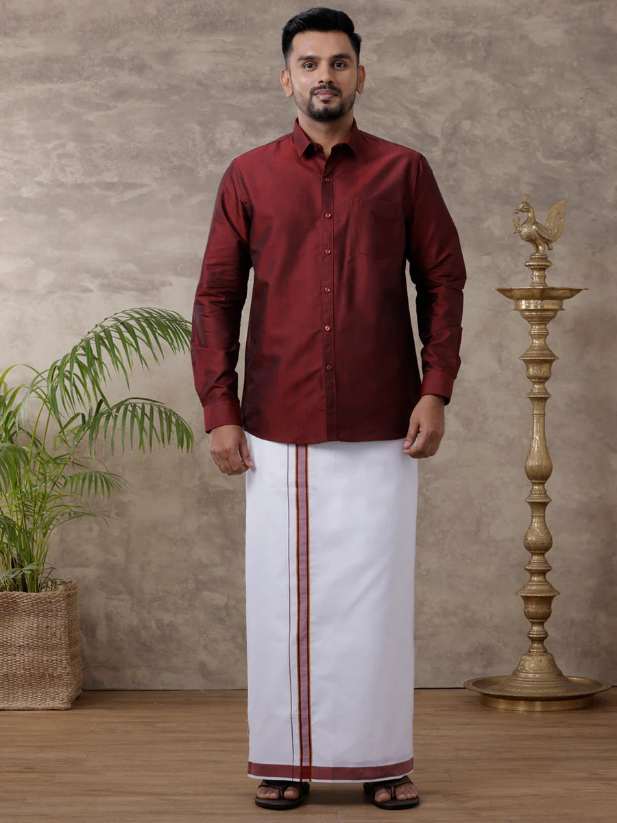 Men Matching Jari Border Dhoti & Full Sleeves Shirt Set Maroon