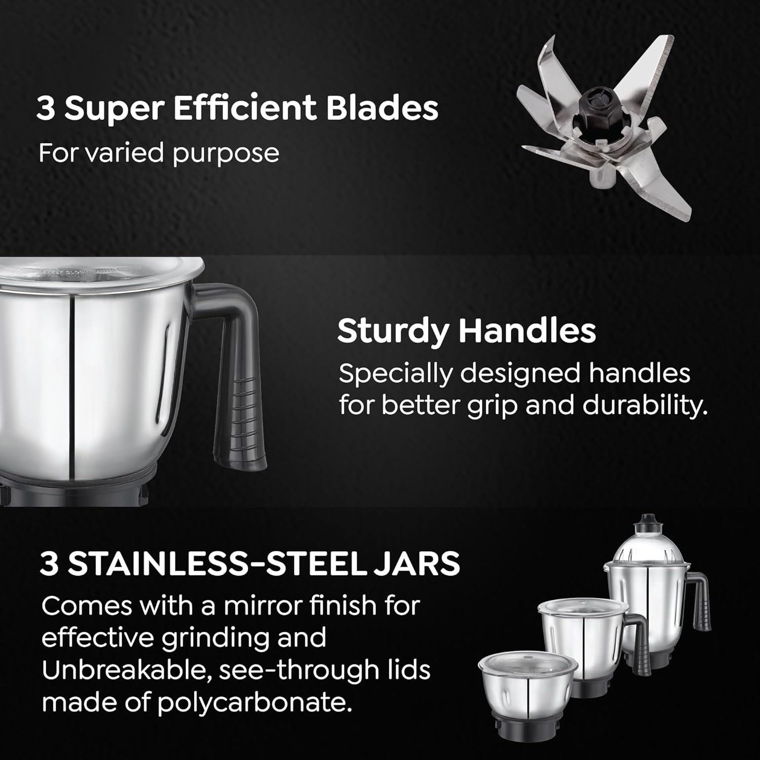 Capacity – Wet grinding jar: 1.5 L, dry grinding jar: 1 L, chutney jar: 450 ml.