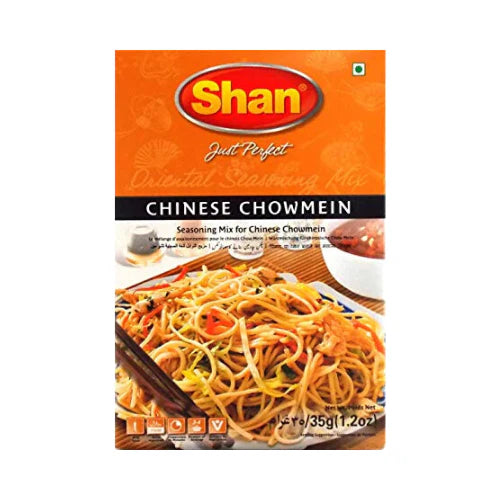 Shan Chinese Chowmein Oriental Seasoning Mix 35gm- Shan's 35g Chinese Chowmein Mix - a quick stir-fry delight. Ingredients: Maltodextrin, Salt, Black Pepper, Sugar, Soy Sauce Powder (Wheat, Soy Bean, Salt), Garlic, Ginger, Yeast Extract, Acid: Citric Acid &Acetic Acid, Anticaking Agent: Silicon Dioxide.