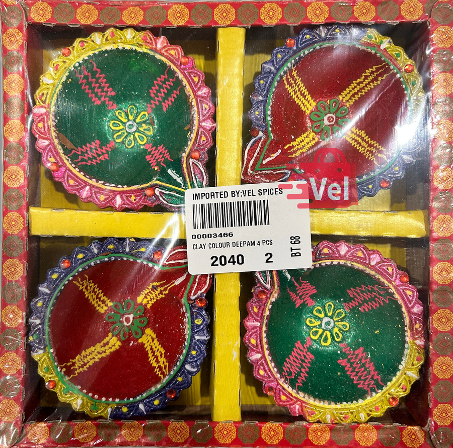 Diya Set of 4 – Red-Blue & Green-Yellow-Pink Mix with Yellow Line Pattern | Decorative Tealight Diyas for Diwali Pooja & Home Decor